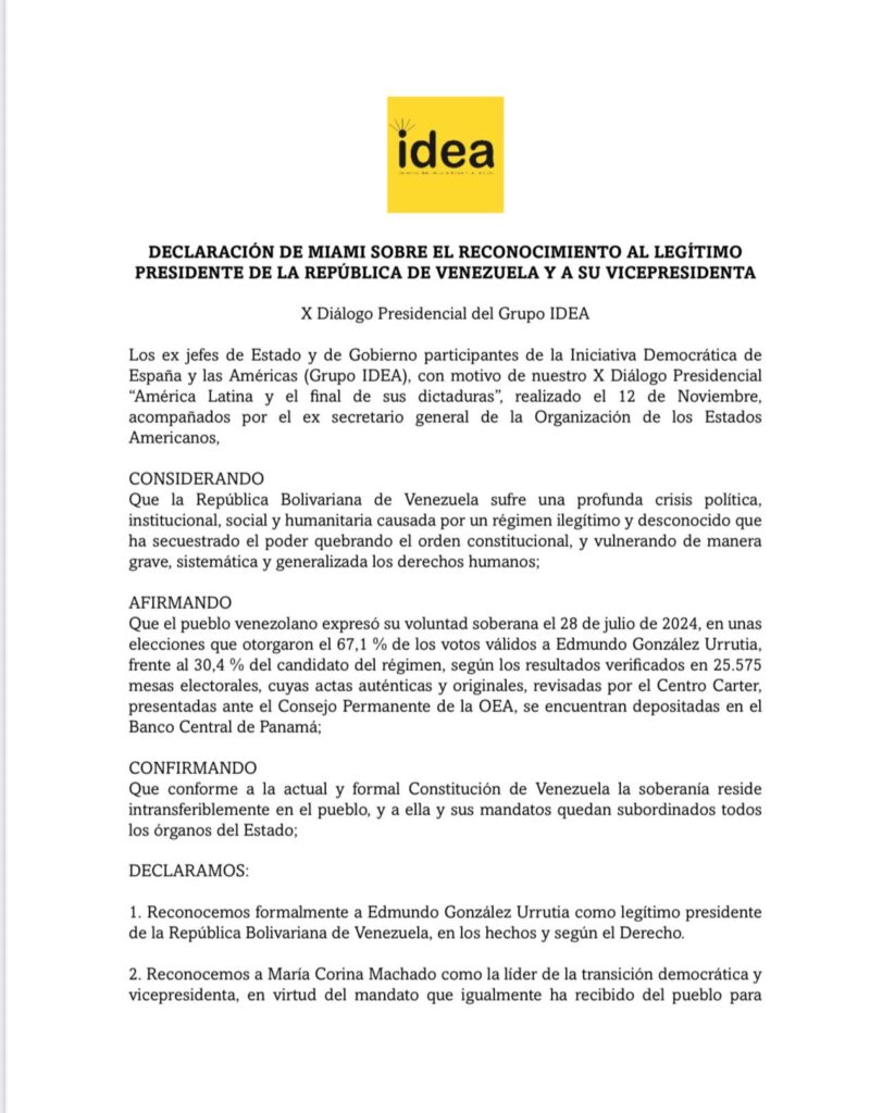 En el marco del X Diálogo Presidencial del Grupo IDEA, realizado en el Miami Dade College – Wolfson Campus, 31 exjefes de Estado y de Gobierno de Iberoamérica y España emitieron una declaración conjunta en la que reconocen formalmente a Edmundo González Urrutia como presidente legítimo de Venezuela, y a María Corina Machado como vicepresidenta y líder de la transición democrática.