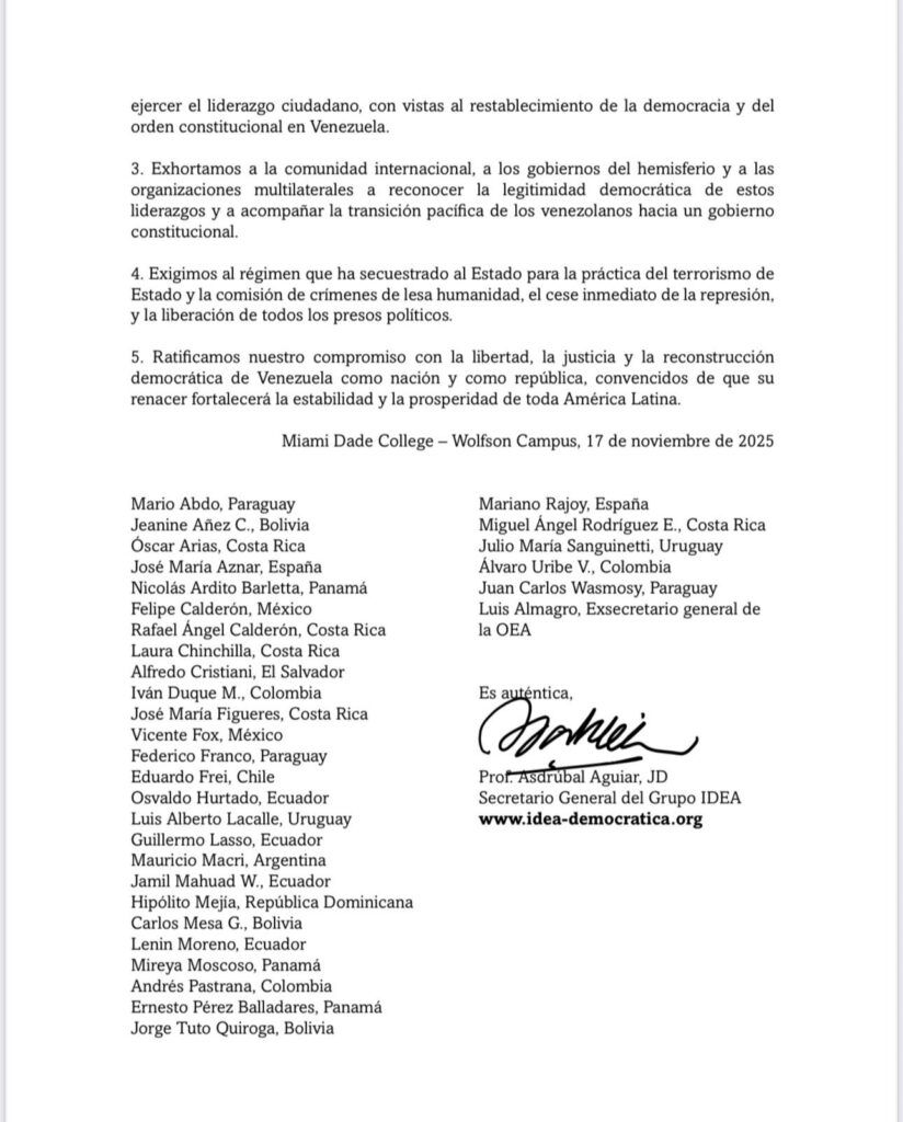 La declaración fue avalada por el secretario general del Grupo IDEA, Asdrúbal Aguiar, y subraya que la reconstrucción democrática de Venezuela es clave para la estabilidad y prosperidad de América Latina.