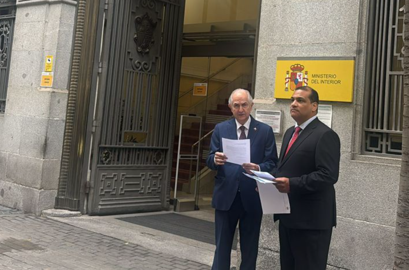 El coordinador del Consejo Político Internacional de María Corina Machado y Edmundo González, Antonio Ledezma, junto al abogado Tamara Arias Castillo, presentaron este jueves una denuncia formal ante el Ministerio del Interior de España por las amenazas recientes del ministro de Interior del régimen chavista, Diosdado Cabello, contra opositores venezolanos en el exilio.