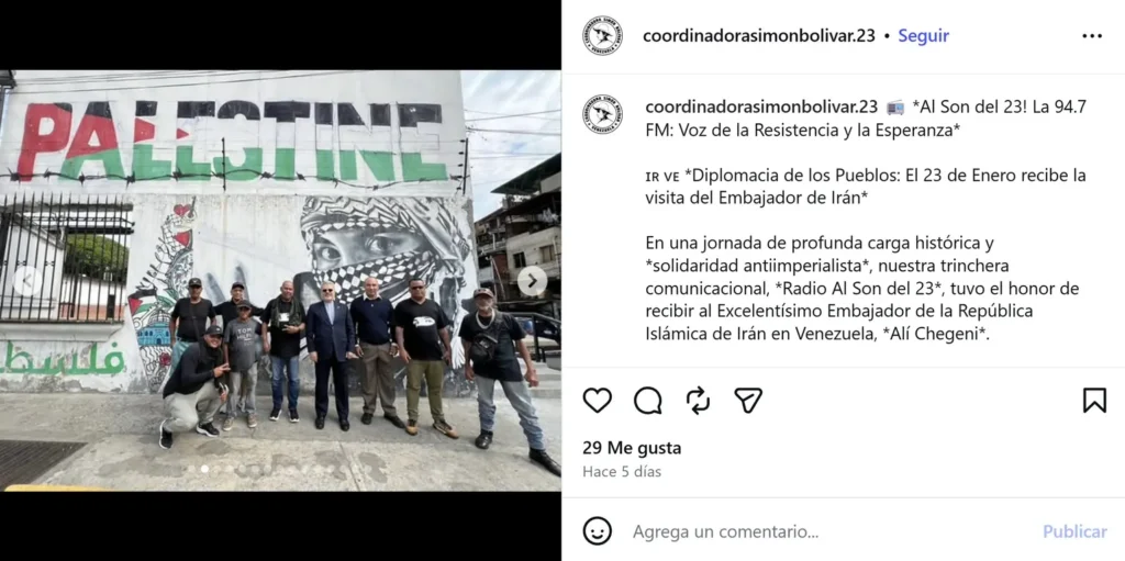 Las publicaciones originales describieron la actividad como un acto de “solidaridad antiimperialista” y “diplomacia de los pueblos”, identificando explícitamente a los acompañantes del embajador como colectivos paramilitares del 23 de Enero.