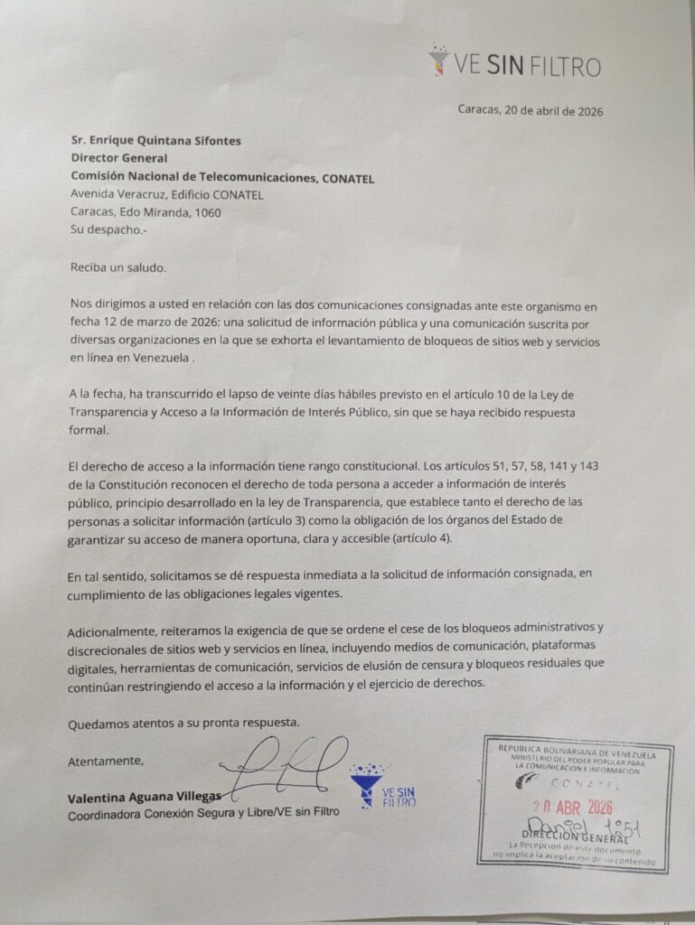 La carta, firmada por Valentina Aguana Villegas, coordinadora de Conexión Segura y Libre de VE sin Filtro, fue dirigida al director general de Conatel, Enrique Quintana Sifontes, y señala que ha vencido el plazo de 20 días hábiles establecido en el artículo 10 de la Ley de Transparencia y Acceso a la Información de Interés Público sin que el organismo haya emitido respuesta formal. «El derecho de acceso a la información tiene rango constitucional. La obligación de los órganos del Estado es garantizar su acceso de manera oportuna, clara y accesible», subraya el documento.