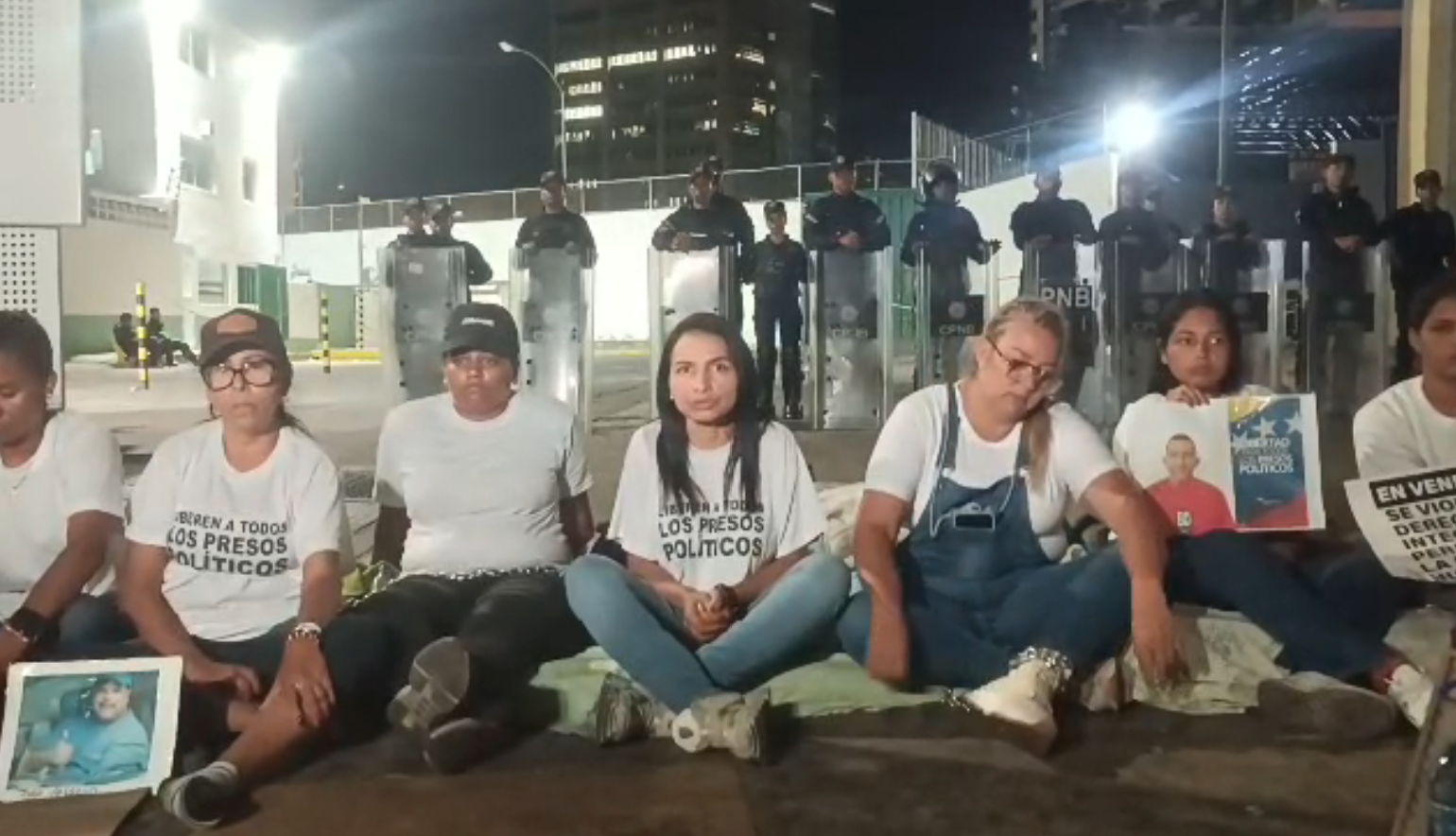 Una de las mujeres presentes, visiblemente afectada, se pronunció en nombre de los familiares: “Buenas noches. Aquí nos encontramos los familiares de Zona 7 para notificarles que el día de hoy iniciaron nuestros familiares allá en el centro penitenciario una huelga de hambre en desesperación al no haber resultados por las promesas efectuadas por Jorge Rodríguez de la liberación de todos nuestros presos políticos de martes al día viernes. Estamos ya a viernes, a esta hora de la noche, y aún no hemos evidenciado ninguna liberación. Por lo tanto, hemos decidido no solo encadenarnos, como lo han visto desde ayer; también hemos decidido unirnos a esta huelga de hambre a partir de mañana a las 6 de la mañana”.