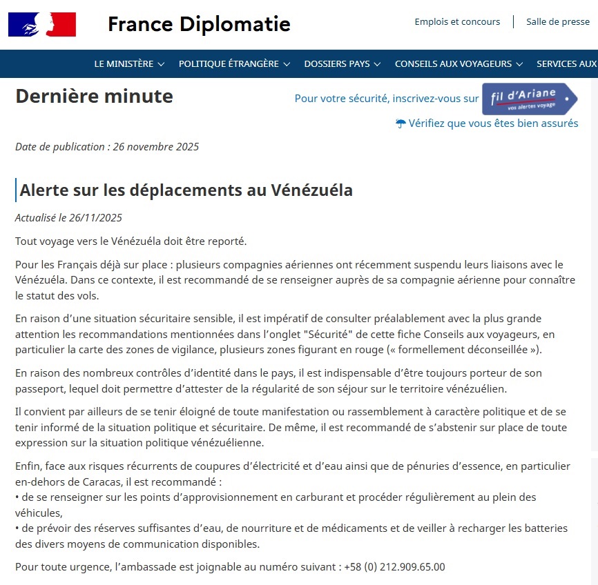 El comunicado, actualizado el 26 de noviembre de 2025, advierte además que varias aerolíneas han suspendido recientemente sus vuelos con destino o salida desde territorio venezolano, por lo que exhorta a los ciudadanos franceses que ya se encuentran en el país a verificar directamente con sus compañías aéreas el estatus de sus conexiones.