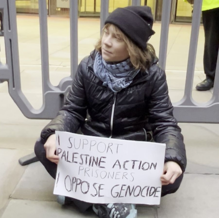 La joven fue detenida en virtud de la ley antiterrorista por sostener un cartel que decía: «Apoyo a los presos de Acción Palestina. Me opongo al genocidio».
