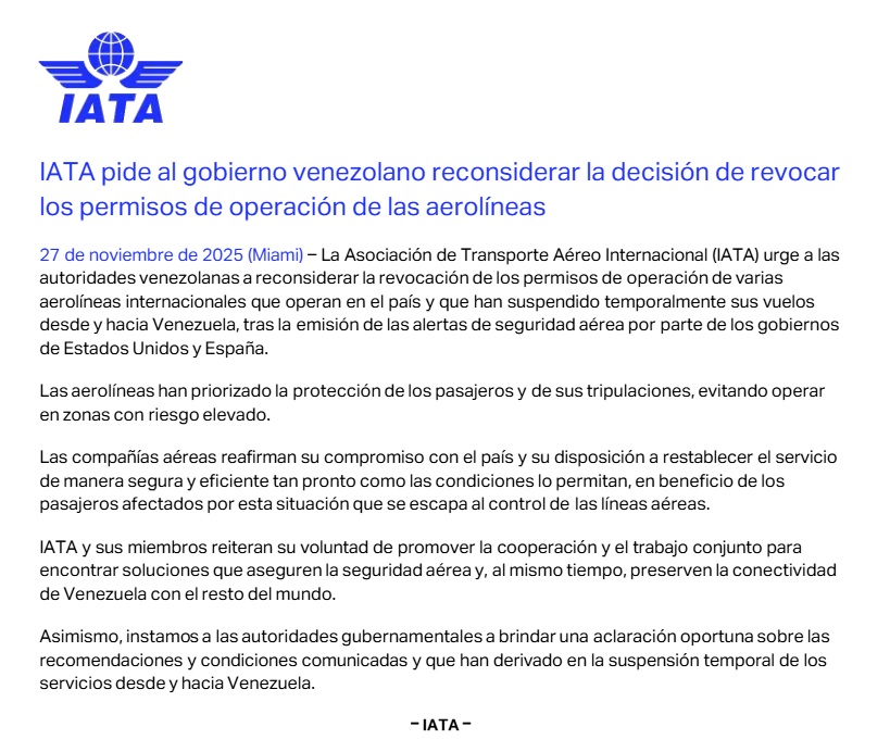 «IATA y sus miembros reiteran su voluntad de promover la cooperación y el trabajo conjunto para encontrar soluciones que garanticen la seguridad aérea y, al mismo tiempo, preserven la conectividad de Venezuela con el resto del mundo», afirmó la entidad en un comunicado.