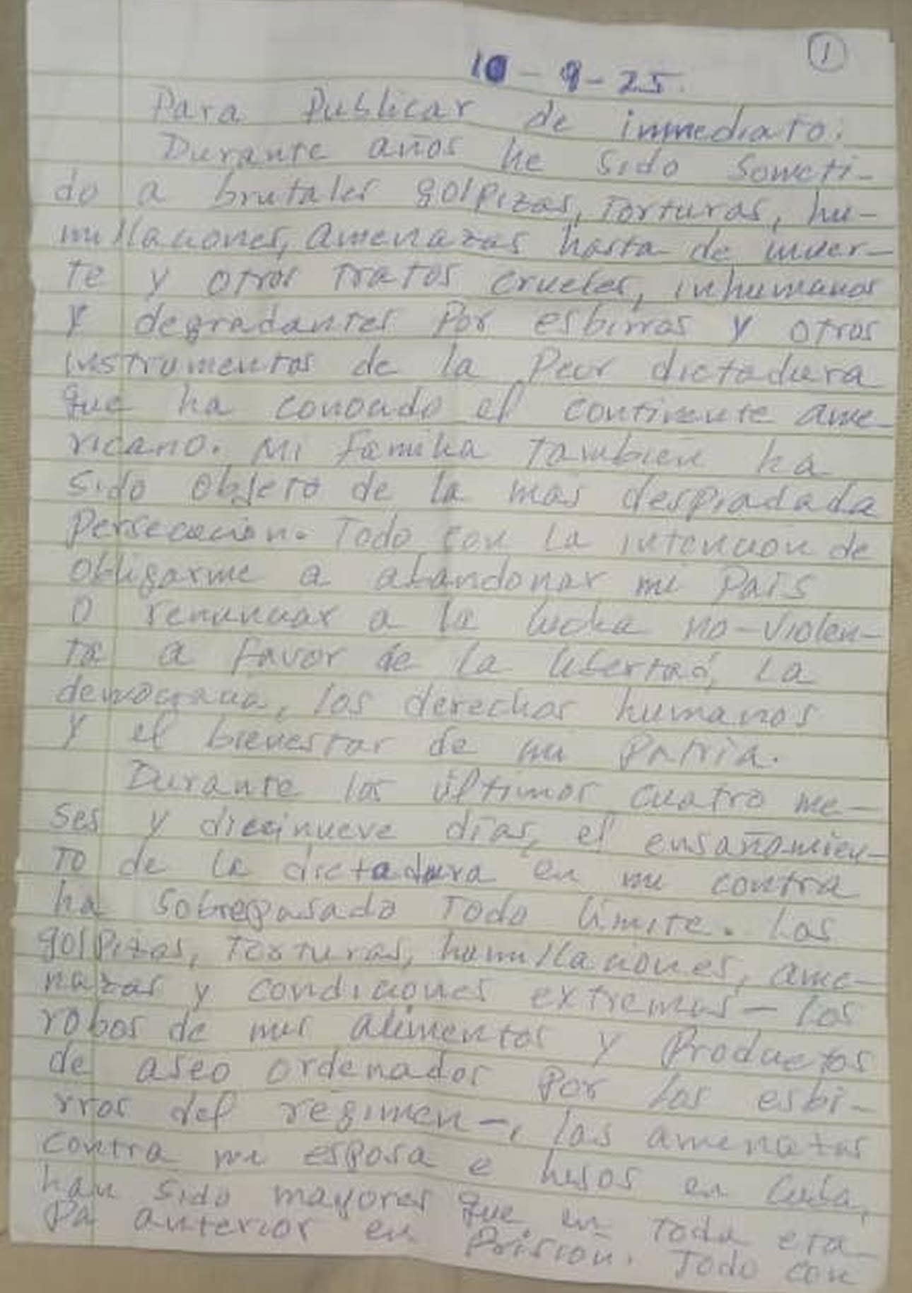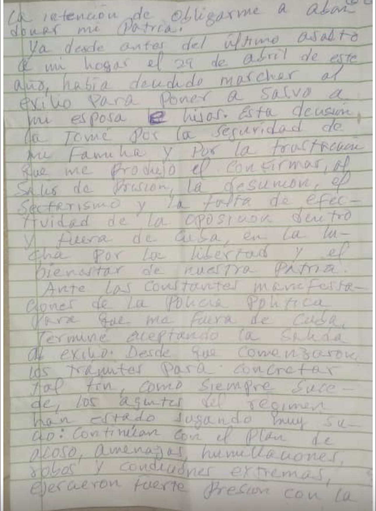El manuscrito de cuatro páginas de Ferrer explica el proceso de toma de decisiones que le llevaron a aceptar su salida forzada de Cuba por motivos políticos tras años de negarse a contemplar esa opción, asumida por decenas de activistas y disidentes cubanos en los últimos años.