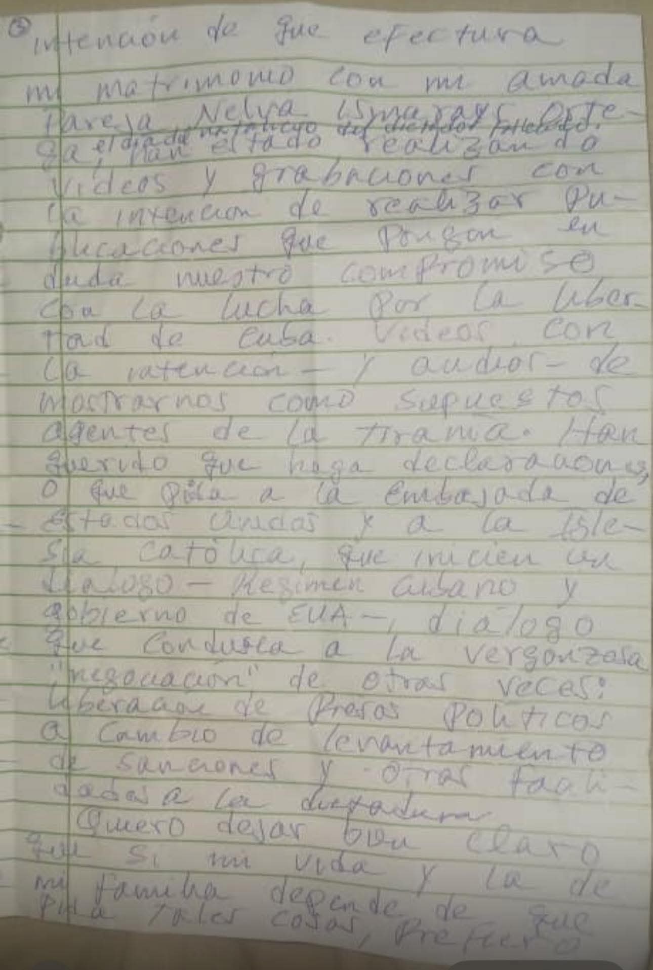 Su hermana Ana Belkis Ferrer publicó en redes sociales una carta manuscrita del opositor encarcelado en la que asegura que las autoridades cubanas quieren que «haga declaraciones o que pida a la embajada de EE.UU. y a la iglesia católica que inicien un diálogo».