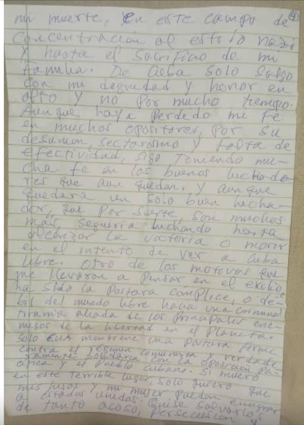 Sin embargo, recalca que prefiere su «muerte en este campo de concentración al estilo nazi y hasta el sacrificio» de su familia, antes de condicionar su exilio a unas declaraciones pactadas o a una petición de diálogo de La Habana con EE.UU. y la iglesia católica.
