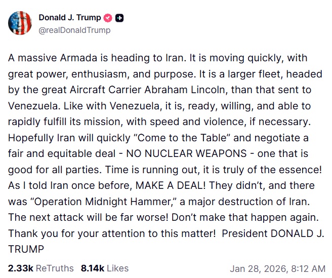 El mensaje del republicano llega después de que llegara a Oriente Medio una flota de la Armada estadounidense que Trump había ordenado dirigirse hacia Irán tras las protestas que sacudieron el país desde finales de diciembre de 2025.