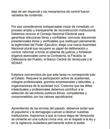 El documento —firmado por Alberto Ray, Arnoldo Gabaldon Berti, Benjamin Scharifker, Claudio Bifano, Sary Levy Carciente, Juan Pablo Olalquiaga, Milos Alcalay, Vladimiro Mujica y Aquiles Martini Pietri— sostiene que el país atraviesa uno de los momentos más decisivos de su historia reciente, marcado por el deterioro de las instituciones republicanas, el colapso económico, el daño a la infraestructura y la migración masiva.