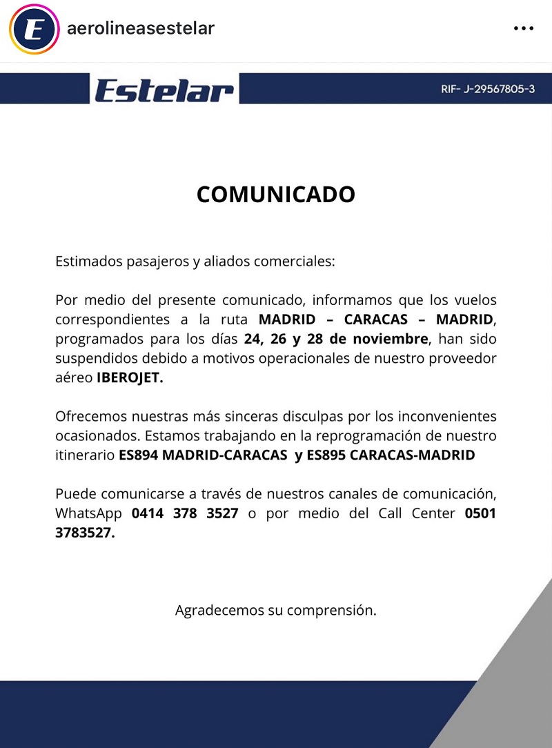 La aerolínea venezolana Estelar anunció este viernes la suspensión de sus vuelos correspondientes a la ruta Caracas-Madrid entre el 24 y el 28 de noviembre por, dijo, motivos operacionales de su proveedor aéreo Iberojet.