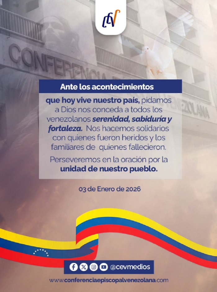 La Conferencia Episcopal Venezuela (CEV) emitió un breve comunicado en el que expresa su solidaridad con todos los venezolanos ante los acontecimientos ocurridos en el país, que llevaron a la extracción y detención de Nicolás Maduro y su esposa, Cilia Flores, por el gobierno de Estados Unidos.