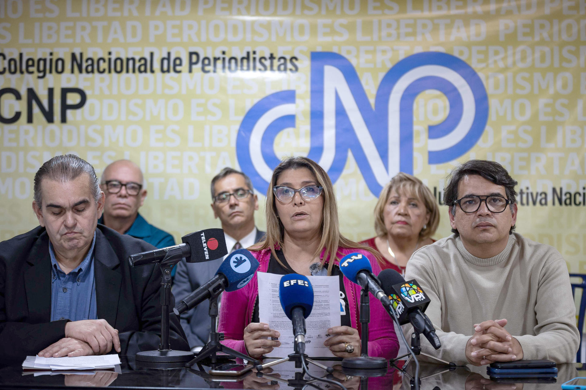 El CNP, cuyo lema es «La verdad no se detiene con violencia», ha sufrido ataques directos en su sede. El 6 de julio de 2025, un grupo de encapuchados armados irrumpió en sus oficinas de Caracas para descolgar una pancarta que mostraba los rostros de 20 periodistas encarcelados. Fundado en 1976, el Colegio agrupa a 26 seccionales en todo el país. El SNTP, fundado el 11 de marzo de 1946, está afiliado a la Federación de Periodistas de América Latina y El Caribe (Fepalc) y a la Federación Internacional de Periodistas (FIP).