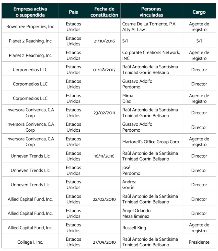 En los últimos 15 años, Gorrín ha creado o adquirido por lo menos 29 empresas, ubicadas en Estados Unidos, Venezuela, Panamá y en algunas islas del caribe. Estás compañías forman parte de su estructura corporativa extendida, con funciones clave como la adquisición de activos, triangulación financiera y registro de propiedad sobre bienes posteriormente incautados, lo cual sugiere su uso como vehículos de ocultamiento y legitimación de fondos.