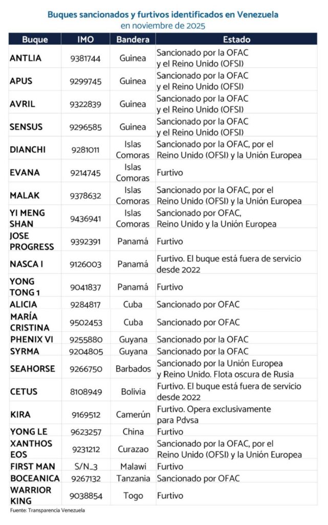 La organización detectó 98 buques petroleros en total, una disminución de 14 respecto a octubre, en un contexto marcado por el operativo militar estadounidense en el Caribe y el aumento de tensiones con el régimen de Nicolás Maduro.