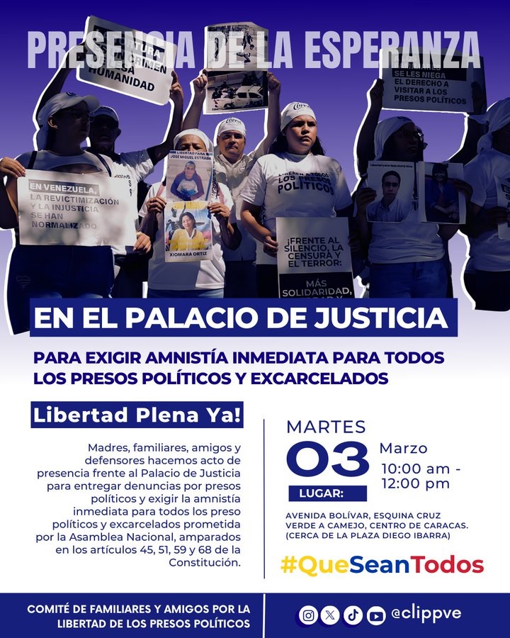 La ONG Comité por la Libertad de los Presos Políticos (CLIPPVE) convocó para este martes 03 de marzo, a las 10:00 a. m., un acto denominado “Presencia de la Esperanza” en el Palacio de Justicia, ubicado en la avenida Bolívar, esquina Cruz Verde a Camejo, en el centro de Caracas. La organización informó que madres, familiares, amigos y defensores de derechos humanos acudirán al lugar para exigir la amnistía inmediata de todas las personas detenidas y excarceladas por motivos políticos, medida que —aseguran— fue prometida por la Asamblea Nacional (AN).