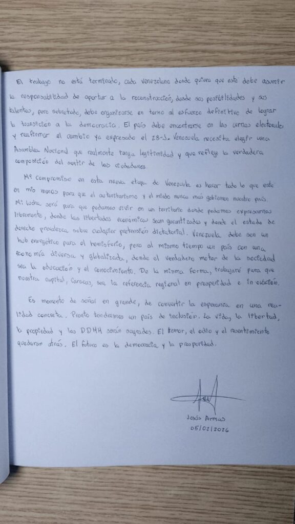 Mi compromiso en esta nueva etapa de Venezuela es hacer todo lo que esté en mis manos para que el autoritarismo y el miedo nunca más gobiernen nuestro país. Mi lucha será para que podamos vivir en un territorio donde podamos expresarnos libremente, donde las libertades económicas sean garantizadas y donde el estado de derecho prevalezca sobre cualquier pretensión dictatorial. Venezuela debe ser un hub energético para el hemisferio, pero al mismo tiempo un país con una economía diversa y globalizada, donde el verdadero motor de la sociedad sea la educación y el conocimiento. De la misma forma, trabajaré para que nuestra capital, Caracas, sea la referencia regional en prosperidad e innovación.