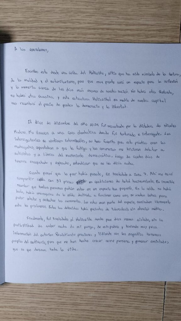 El diez de diciembre del año 2024 fui secuestrado por la dictadura de Nicolás Maduro. Me llevaron a una casa clandestina donde fui torturado e interrogado. Los interrogatorios se sintieron interminables, su hora favorita para esta práctica eran las madrugadas, apostaban a que la fatiga y las amenazas me hicieran delatar a activistas y a líderes del movimiento democrático. Luego de cuatro días de tenerme encapuchado y esposado, entendieron que no les diría nada.