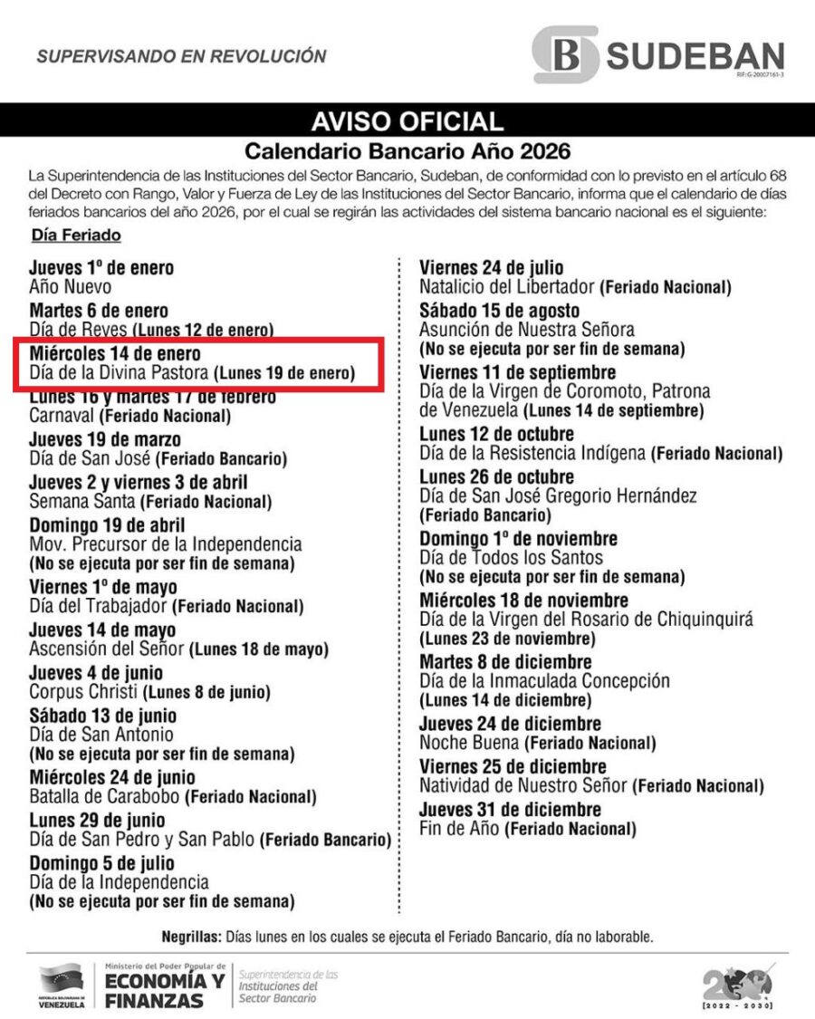 La Superintendencia de la Instituciones del Sector Bancario (Sudeban) informa que las entidades bancarias del país no laborarán este lunes 19 de enero por el día de la Divina Pastora, que se celebró el miércoles 14.