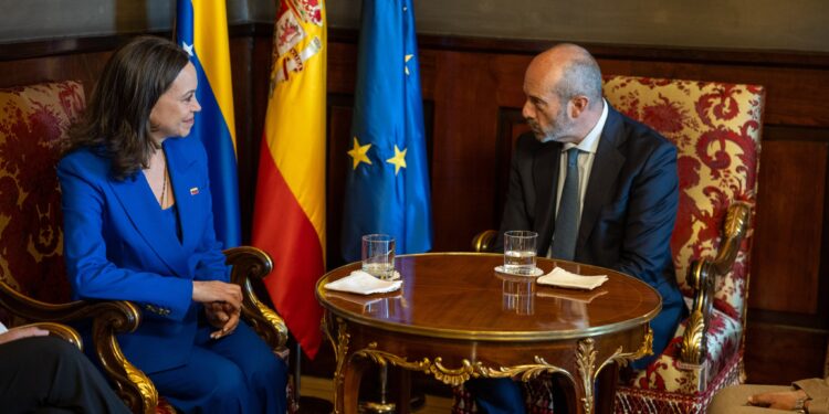 El presidente del Senado de España, Pedro Rollán, recibió este lunes a la líder venezolana y Premio Nobel de la Paz, María Corina Machado, en la Plaza de la Marina Española, sede de la Cámara Alta española.