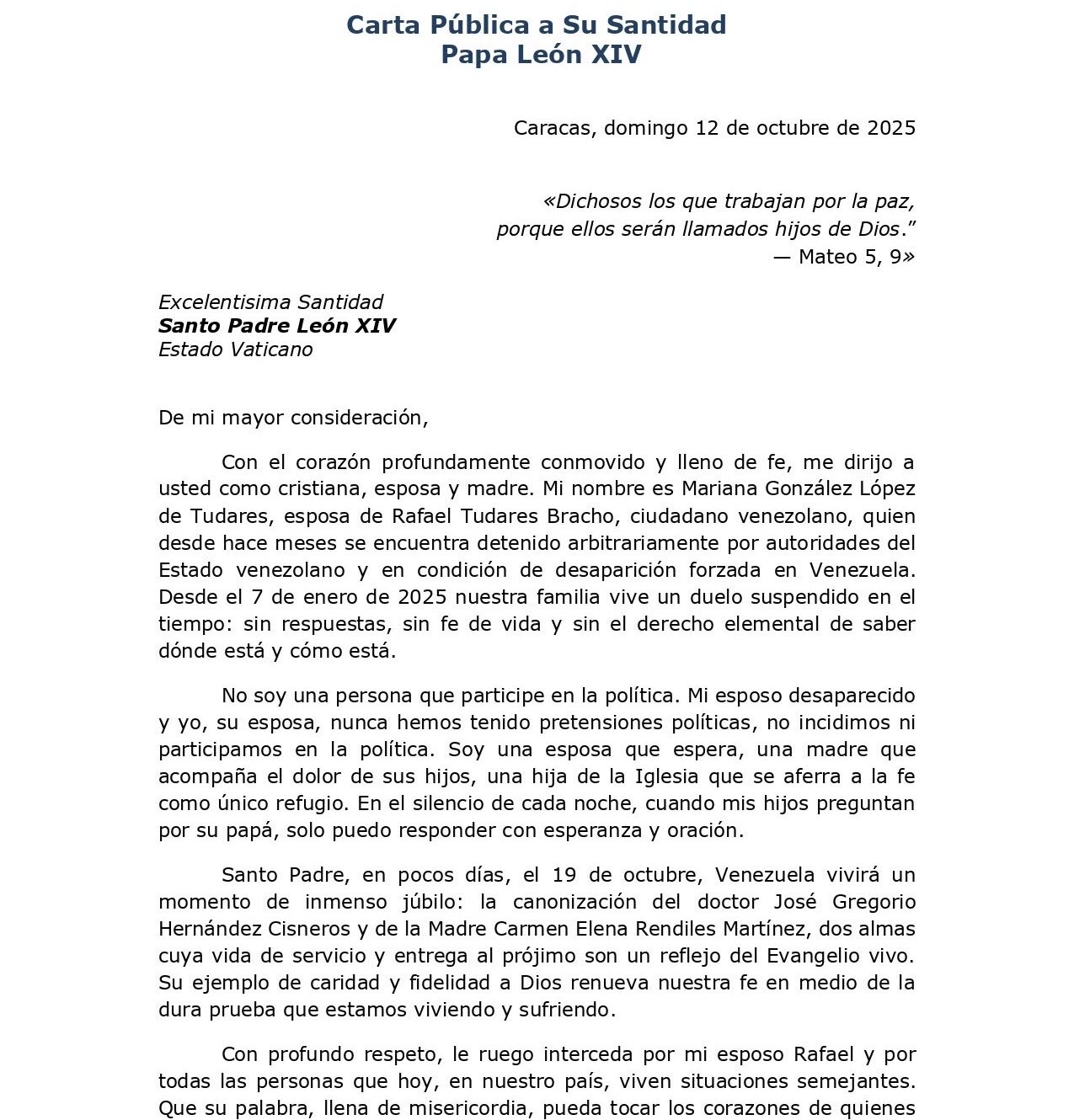 «Hoy (domingo) se cumplen 278 días desde la desaparición forzada y detención arbitraria de mi esposo, Rafael Tudares Bracho. Dirijo esta carta abierta a su Santidad el Papa León XIV para implorar su voz ante tanto dolor y silencio. Ruego su intercesión, por la fe de vida de mi esposo», escribió González de Tudares en su cuenta oficial en la red social X.