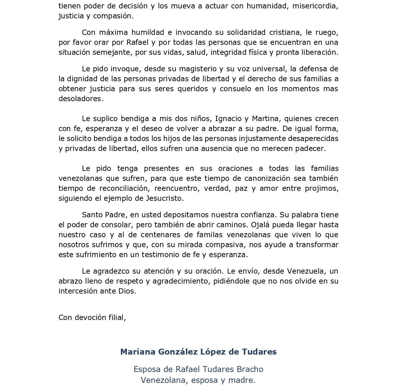Mariana González de Tudares, esposa de Rafael Tudares Bracho, envió este domingo una carta al papa León XIV al cumplir 278 días en desaparición forzada.