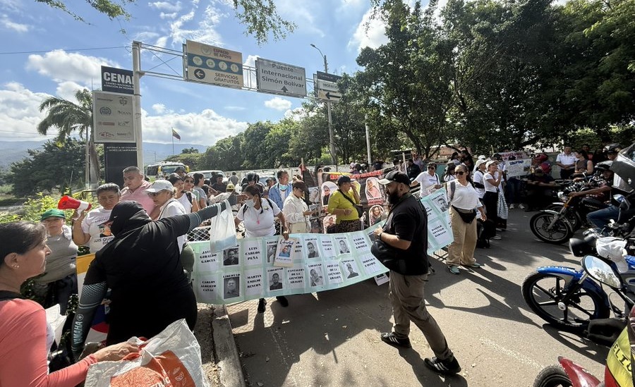 El paso se encuentra bloqueado por la protesta de los familiares de colombianos que permanecen en cárceles venezolanas. pic.twitter.com/lDIIMU35GA