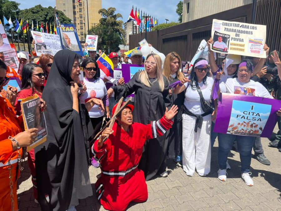 Algunas de las madres y esposas presentes en la protesta, vistieron con el mono rojo del uniforme de PDVSA y otras vestían con togas negras, representando al sistema de justicia venezolano.