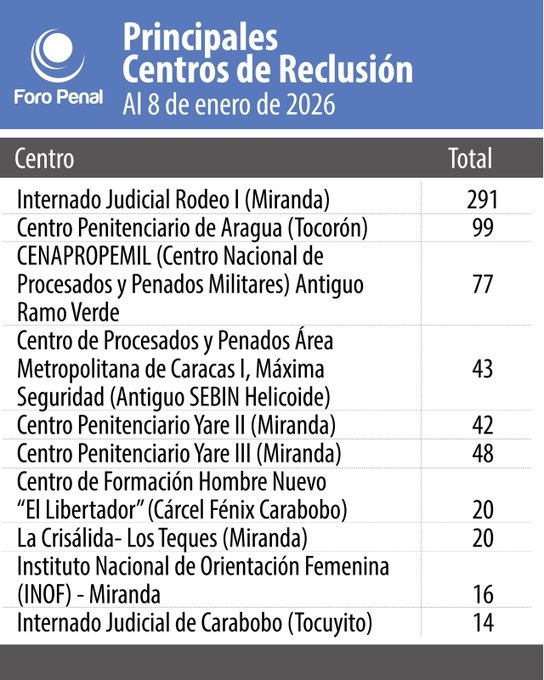 La ONG Foro Penal difundió este jueves la distribución de presos políticos que se encuentran en los diferentes centros de detención en Venezuela hasta este 8 de enero de 2026.