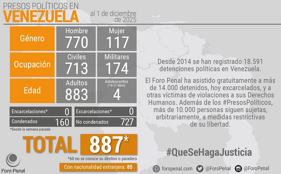 La ONG Foro Penal Venezolano actualizó la cifra de presos políticos en Venezuela, la cual subió a 887, de los cuales 85 tienen nacionalidad extranjera.