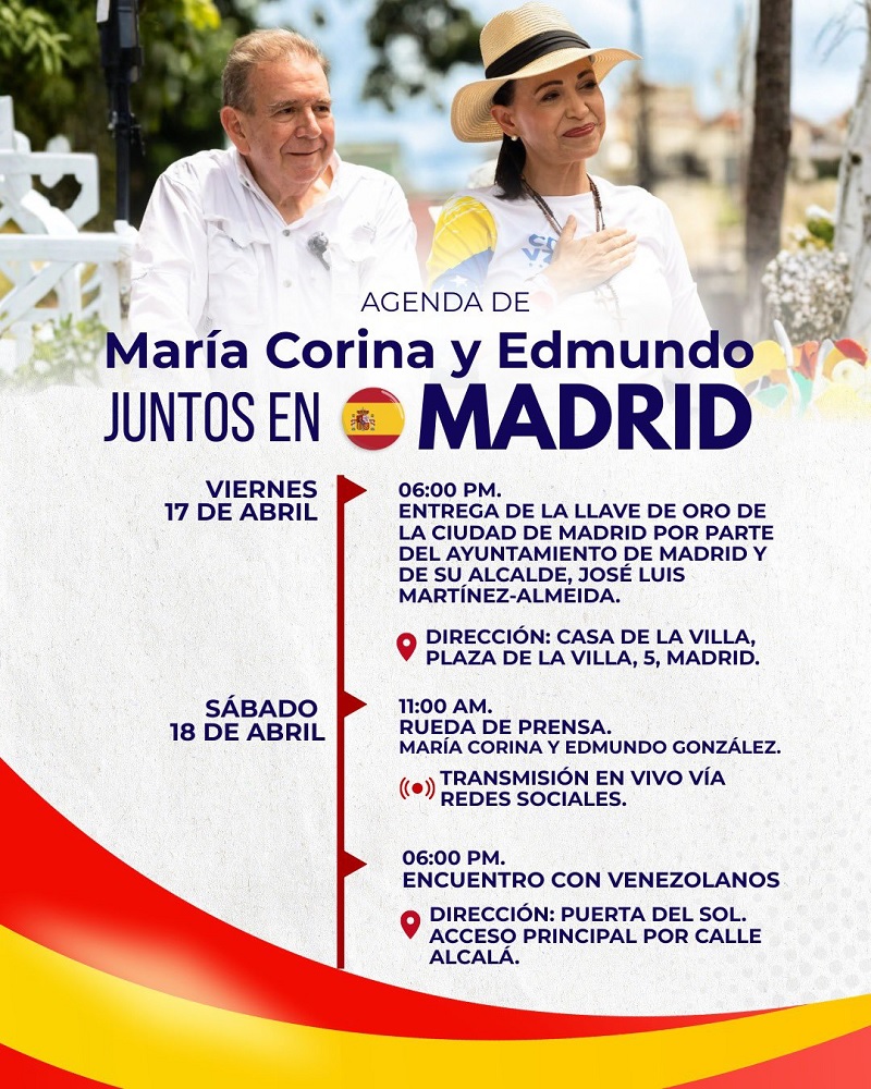 Luego, la agenda continuará el sábado 18 de abril a las 11 de la mañana (hora local) con una rueda de prensa en la que participarán Machado y González Urrutia, la cual contará con transmisión en vivo vía redes sociales.