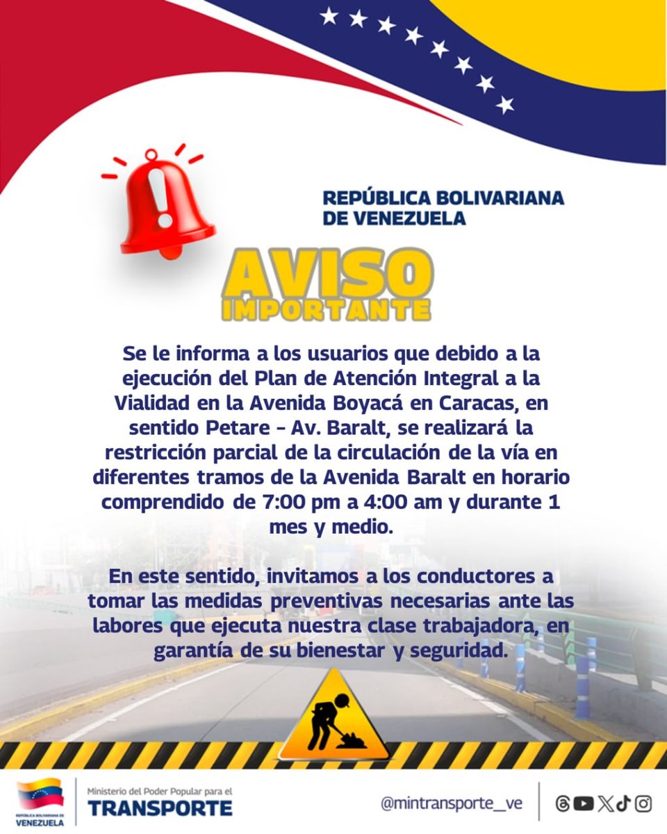 El horario de estos trabajos es de 7 de la noche hasta las 4 de la madrugada, e indicó que los 13 kilometros, entre Petare y la Avenida Baralt, será reparada toda el ala sur.