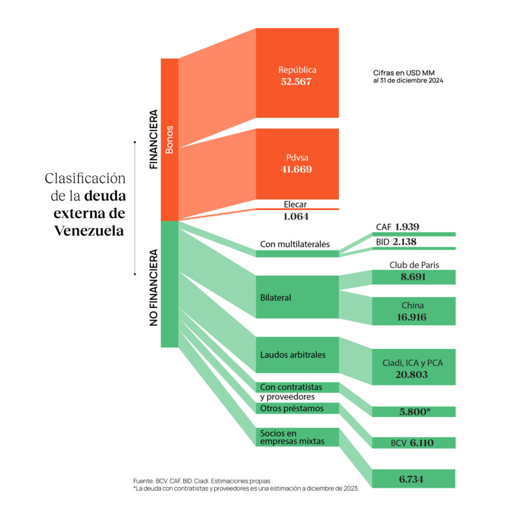 Por otro lado, la deuda no financiera de Venezuela ronda los USD 69.131 millones de dólares o 42%. Aquí se incluyen, entre otras, las deudas adquiridas con bancos multilaterales; con otros países a partir de acuerdos bilaterales; con empresas privadas socias en empresas mixtas, así como con firmas multinacionales que operaban en Venezuela, cuyos activos fueron expropiados o confiscados y terminaron demandando en cortes internacionales.