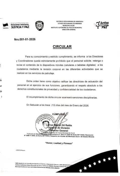 Posteriormente, el alcalde del municipio Maracaibo, Gian Carlo Di Martino, se sumó a esta ratificación al declarar que “está totalmente prohibido que un funcionario policial revise un teléfono en una alcabala móvil”, una práctica que, pese a los pronunciamientos oficiales, continúa siendo denunciada por ciudadanos.