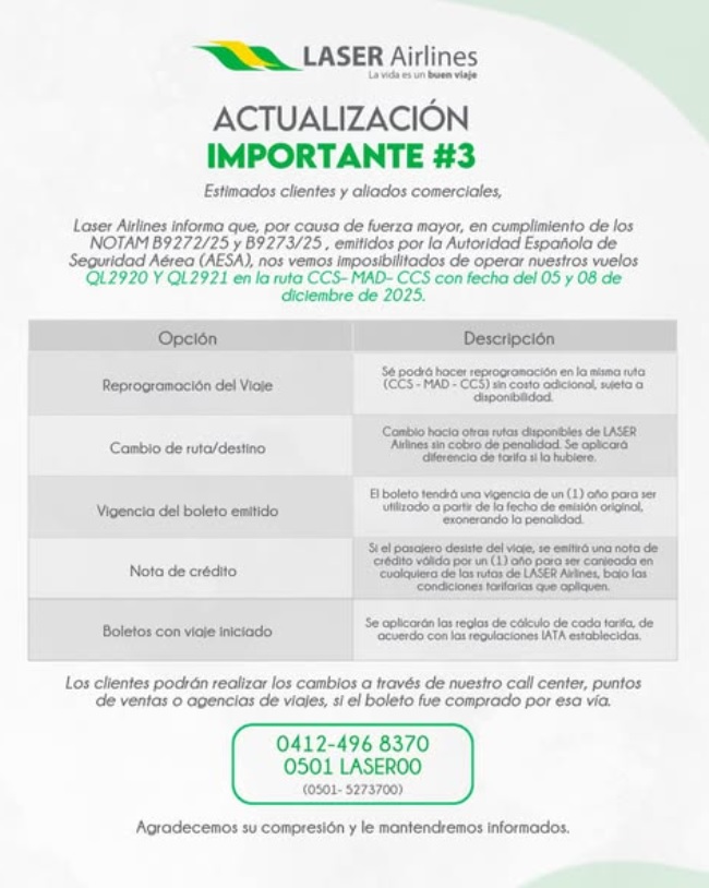 «Laser Airlines informa que, por causa de fuerza mayor, en cumplimiento de los NOTAM B9272/25 y B9273/25 , emitidos por la Autoridad Española de Seguridad Aérea (AESA), nos vemos imposibilitados de operar nuestros vuelos QL2920 Y QL2921 en la ruta CCS– MAD– CCS con fecha del 05 y 08 de diciembre de 2025«, destaca la aerolínea en su cuenta en la red social Instagram.