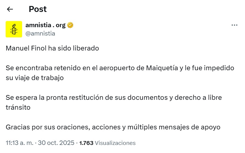 «Manuel Finol ha sido liberado. Se encontraba retenido en el aeropuerto de Maiquetía y le fue impedido su viaje de trabajo. Se espera la pronta restitución de sus documentos y derecho a libre tránsito», informó la ONG en su cuenta oficial en la red social X.