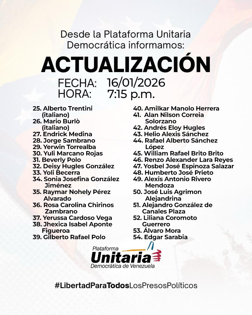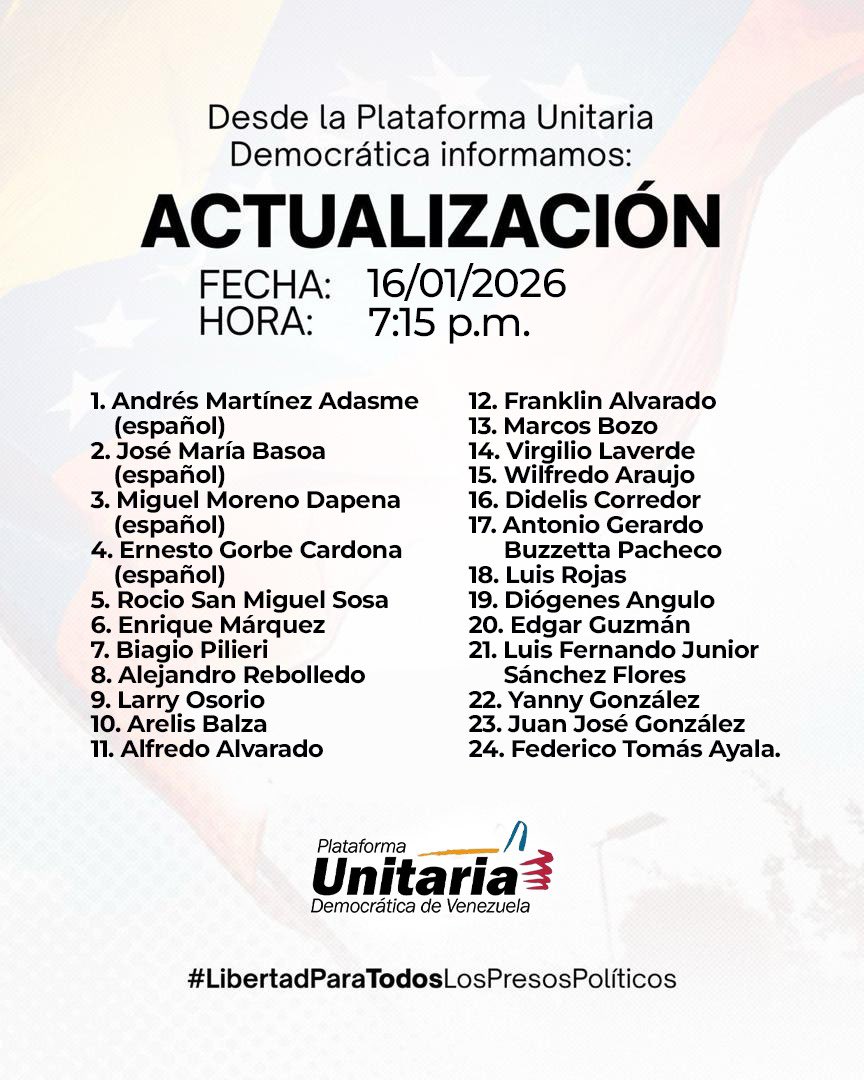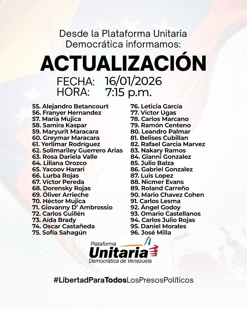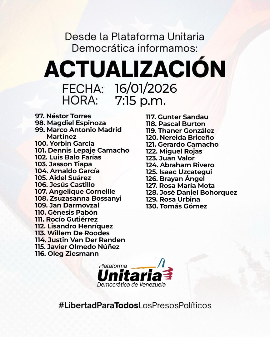 La Plataforma Unitaria Democrática publicó este viernes 16 de enero una lista actualizada y confirmada de presos políticos excarcelados, que ascienden a 130, una cifra muy distinta a los 406 afirmados por la encargada del régimen chavista, Delcy Rodríguez.