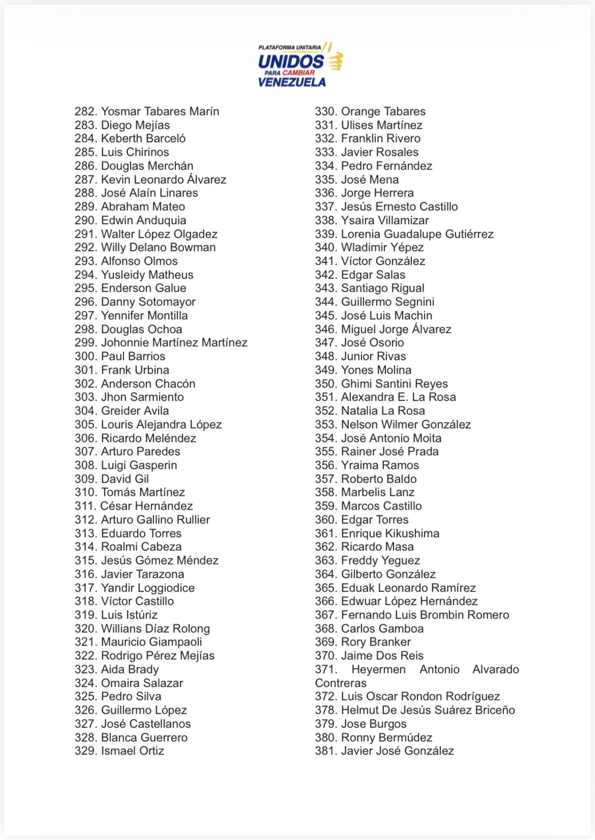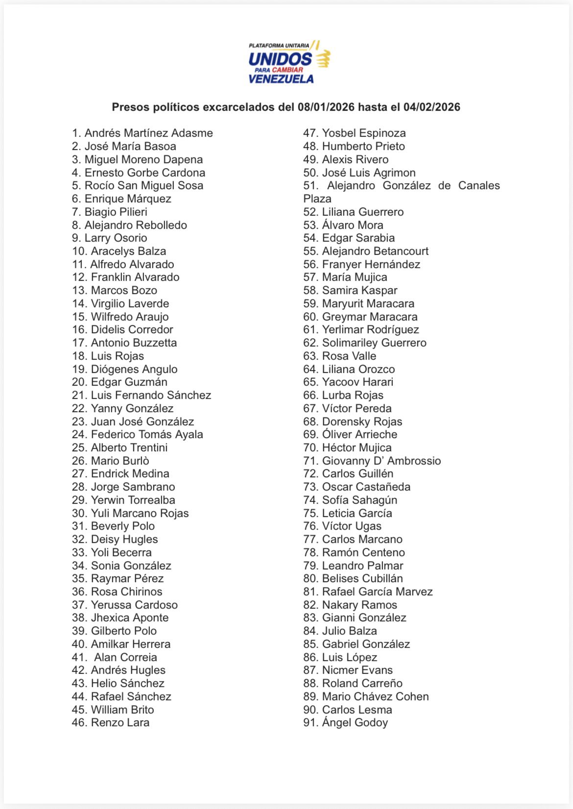 La Plataforma Unitaria Democrática publicó este lunes 2 de febrero la lista actualizada y confirmada de presos políticos excarcelados hasta las 12 del mediodía, que asciende a 381, una cifra muy distinta a los anunciados por la encargada del régimen chavista, Delcy Rodríguez, y a los 823 contabilizados por el ministro de Interior y Justicia, Diosdado Cabello.