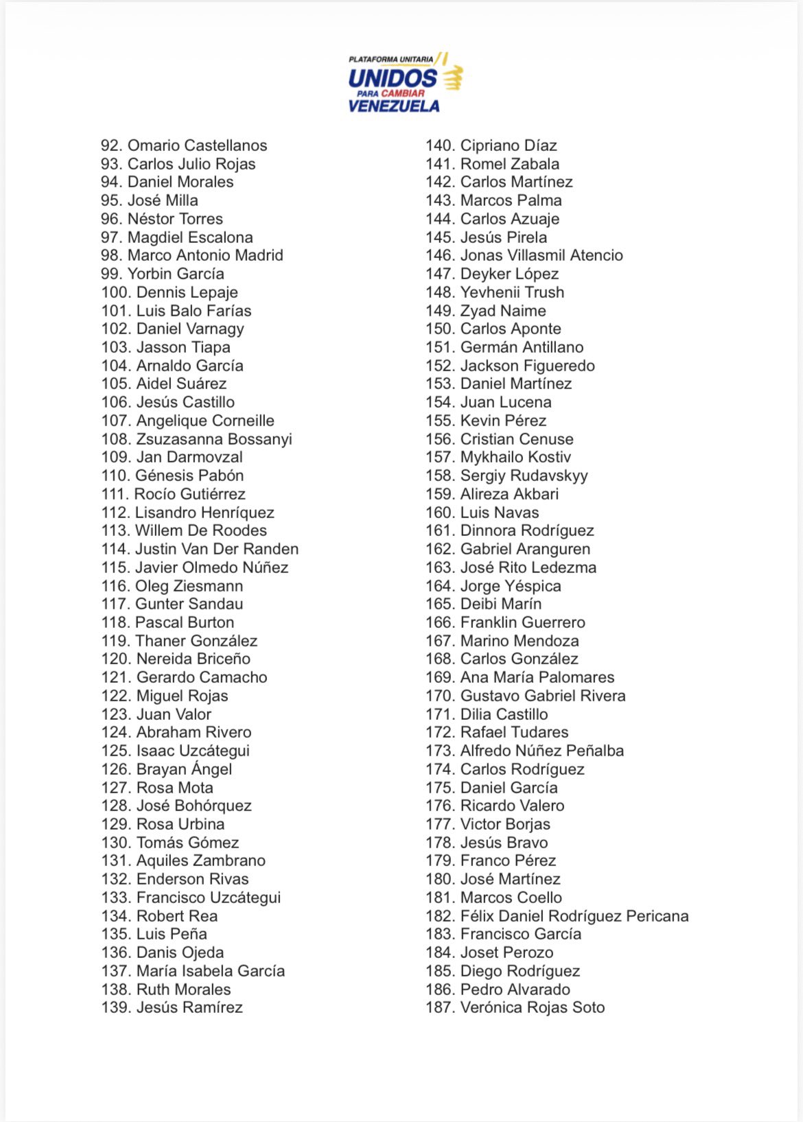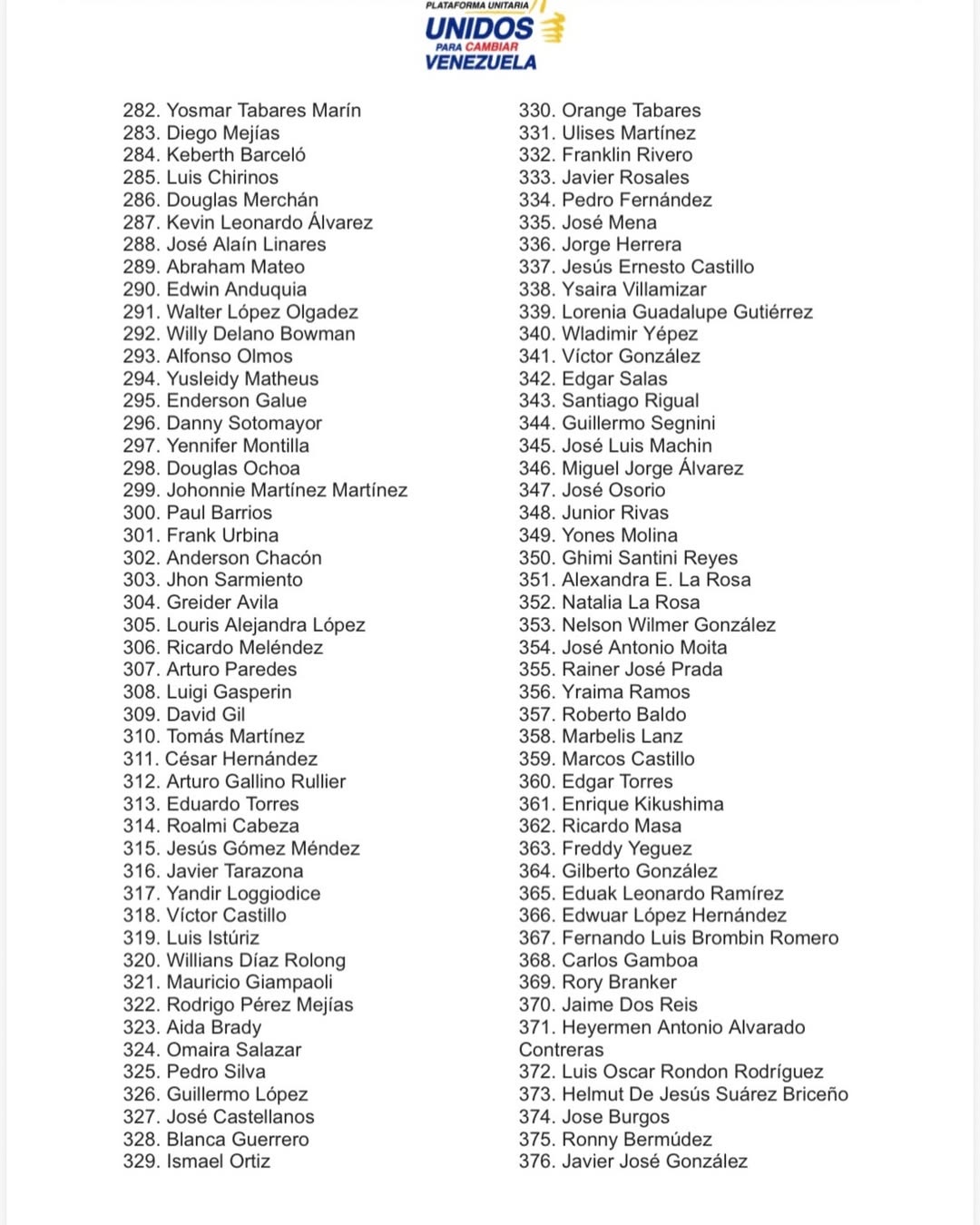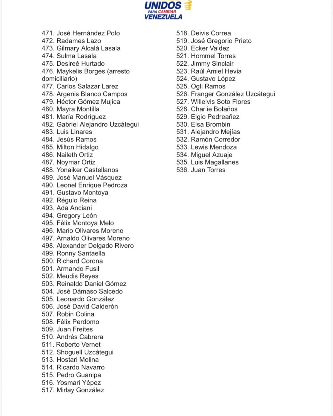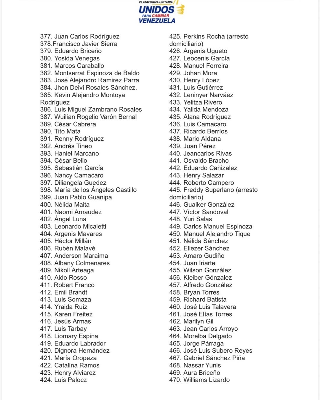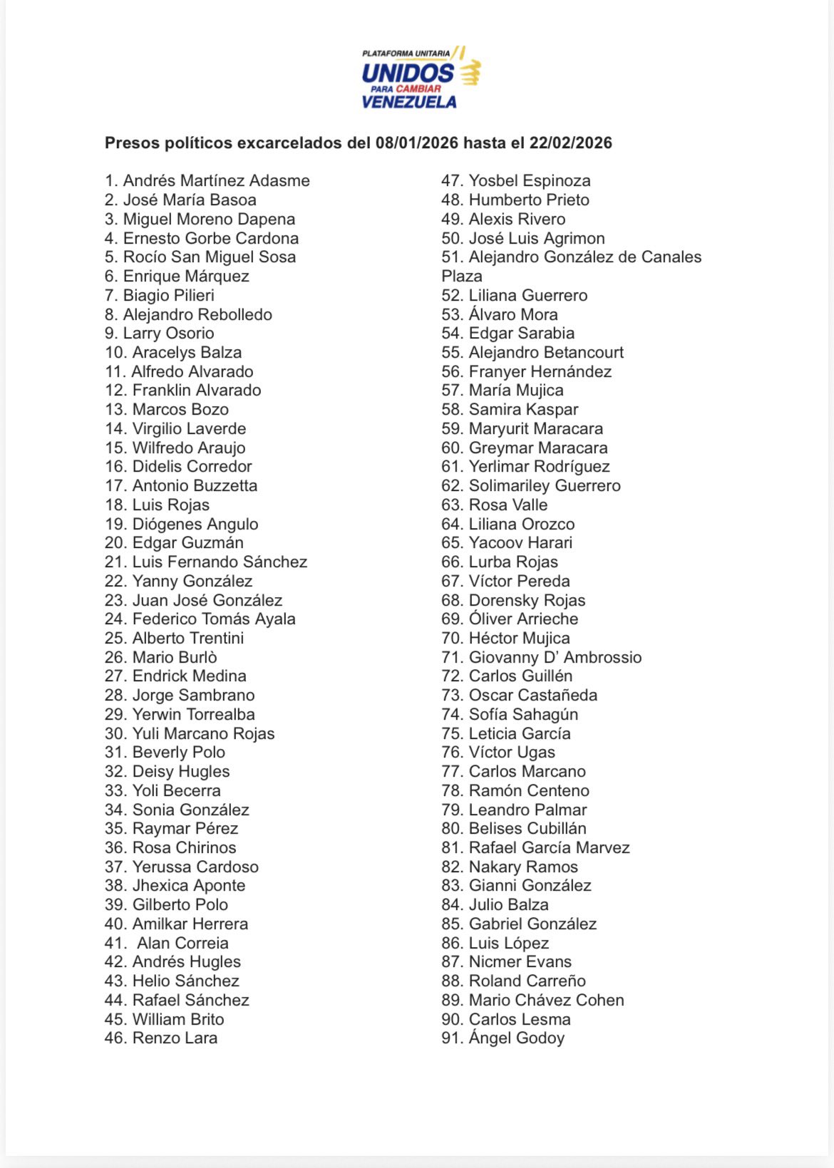 La Plataforma Unitaria Democrática (PUD) publicó el sábado un listado actualizado con la cifra de 536 presos políticos excarcelados confirmados entre el 8 de enero y el 22 de febrero a las 10 de la noche.