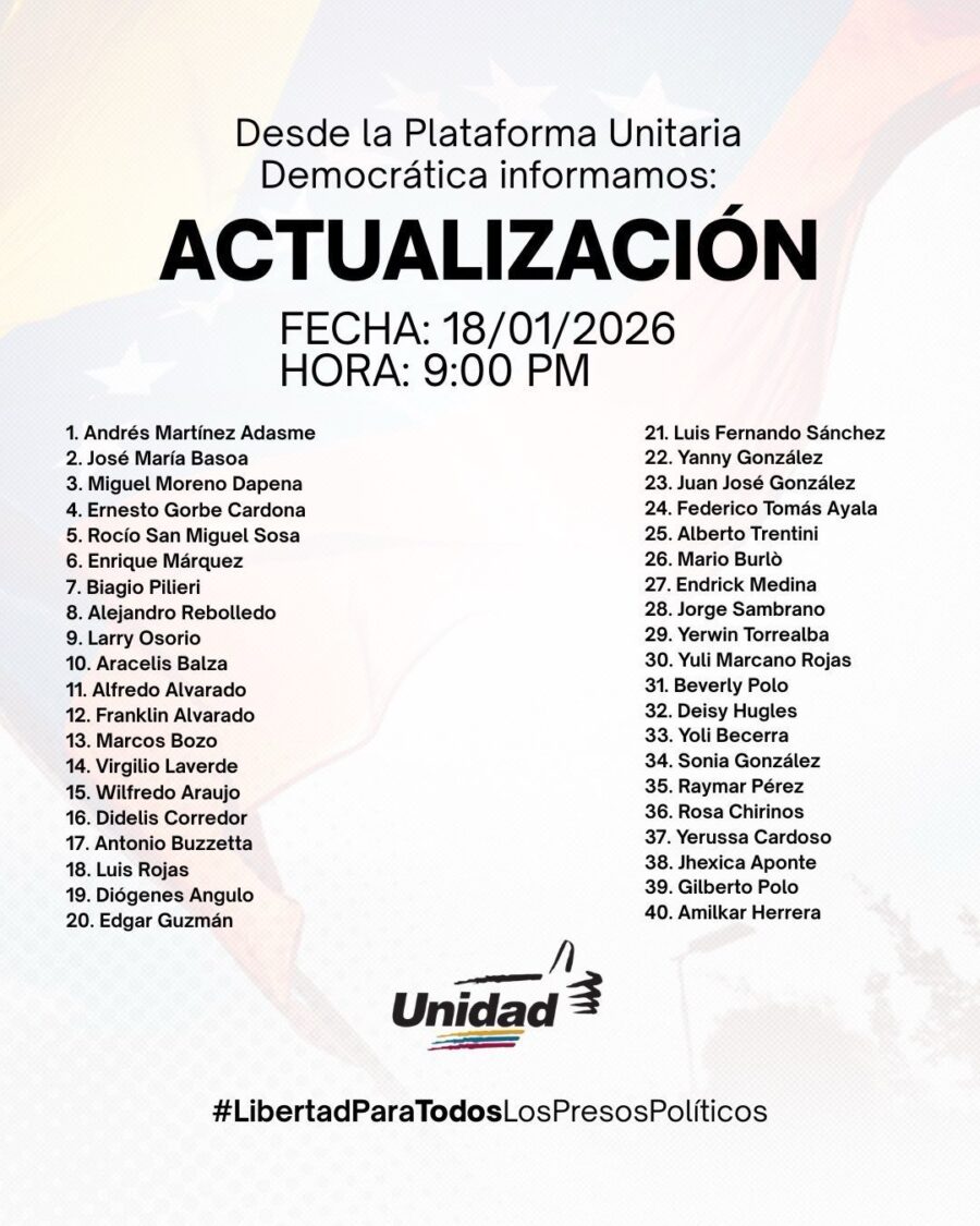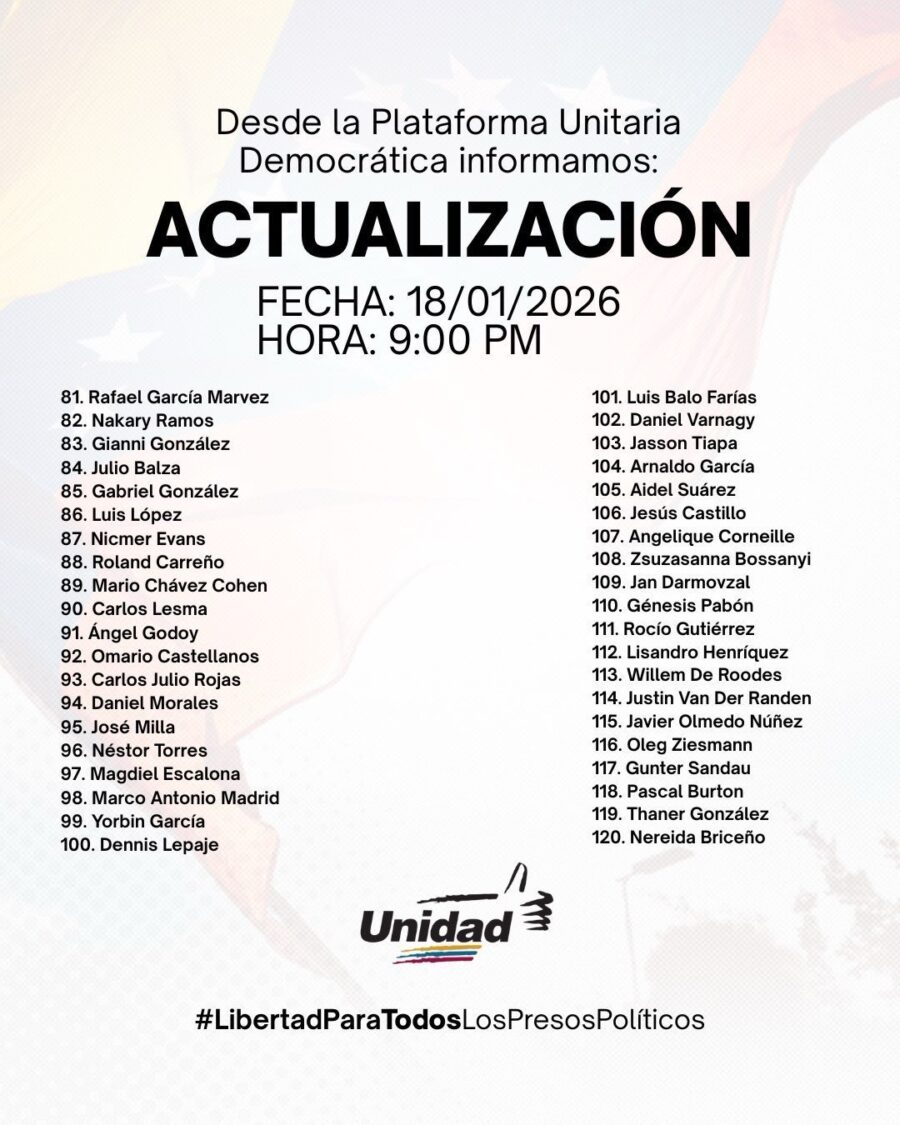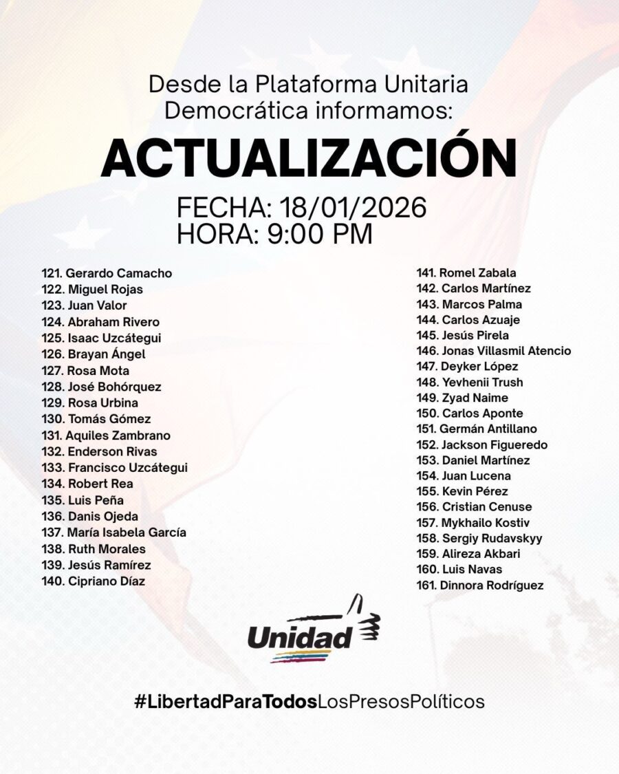 La Plataforma Unitaria Democrática publicó este domingo 18 de enero una lista actualizada y confirmada de presos políticos excarcelados, que ascienden a 161, una cifra muy distinta a los 406 afirmados por la encargada del régimen chavista, Delcy Rodríguez.