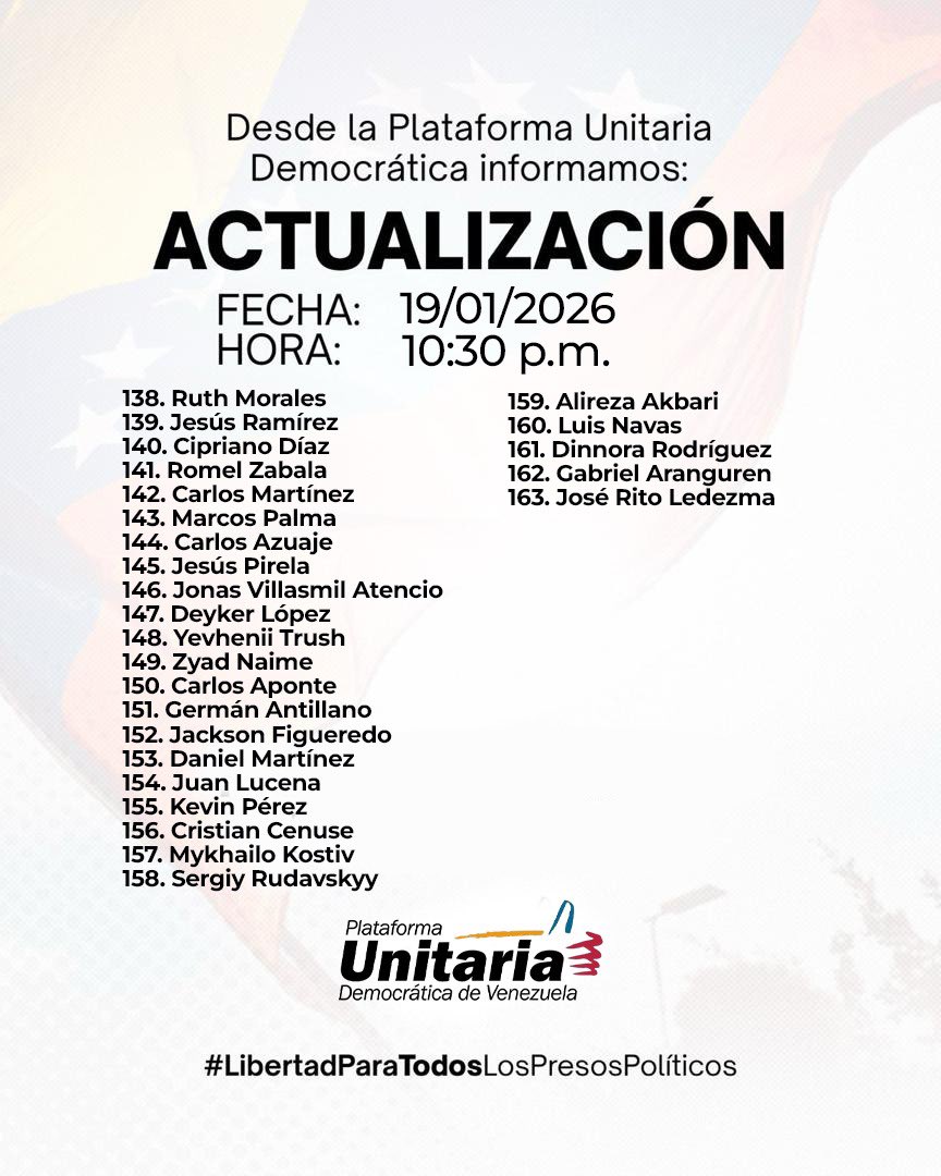 La Plataforma Unitaria Democrática publicó este domingo 18 de enero una lista actualizada y confirmada de presos políticos excarcelados, que ascienden a 163, una cifra muy distinta a los 406 afirmados por la encargada del régimen chavista, Delcy Rodríguez.
