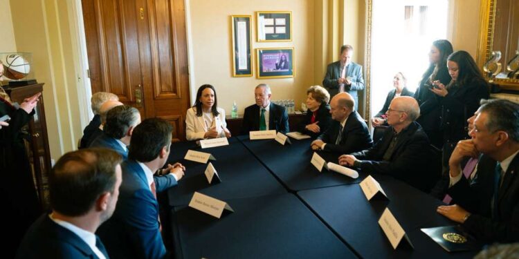 La líder venezolana y Premio Nobel de la Paz María Corina Machado sostuvo este miércoles una reunión en el Capitolio con un amplio grupo de senadores y congresistas estadounidenses de ambos partidos, en medio de la creciente atención internacional sobre la transición política en Venezuela.