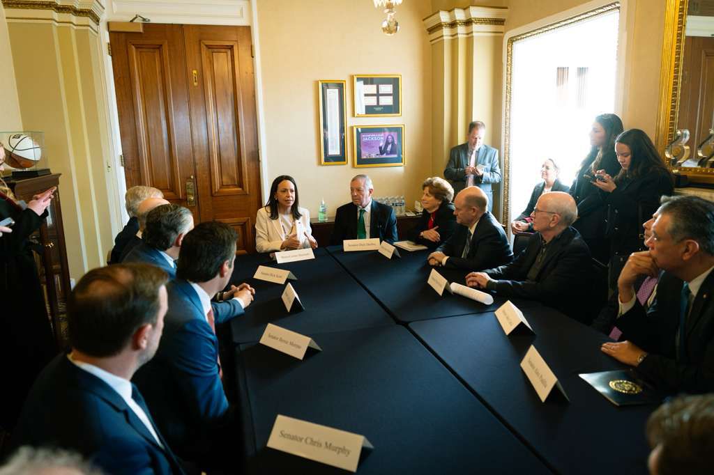 Entre los legisladores presentes estuvieron Jacky Rosen, Alex Padilla, John Curtis, Peter Welch, Jeanne Shaheen, Dick Durbin, Rick Scott, Ted Cruz, Bernie Moreno, Chris Murphy, Tim Kaine, Ruben Gallego y Chris Coons, quienes escucharon durante más de una hora el diagnóstico de Machado sobre la situación del país y sus expectativas para los próximos meses.