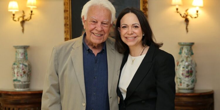 «Un honor haber compartido con nuestro respetado y querido amigo el presidente Felipe González. Tuvimos una conversación fascinante sobre la transición en España y la de ahora, ¡a la venezolana! Gracias por su claridad, firmeza y permanente acompañamiento a nuestra lucha por la democracia y la libertad, querido presidente. Seguimos adelante, con confianza y esperanza en un futuro luminoso para nuestras dos naciones», escribió Machado en sus redes sociales.