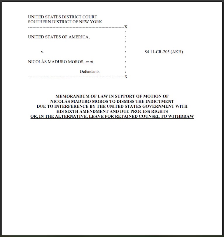 «La OFAC se ha negado a reconsiderar su posición y no otorgará una licencia que permita al Gobierno de Venezuela financiar la defensa, interfiriendo así con el derecho del Sr. Maduro a contratar el abogado de su elección», con lo cual solicita al tribunal «que desestime la cuarta acusación sustitutiva en su contra», indicaron los argumentos de la moción en la plataforma judicial.