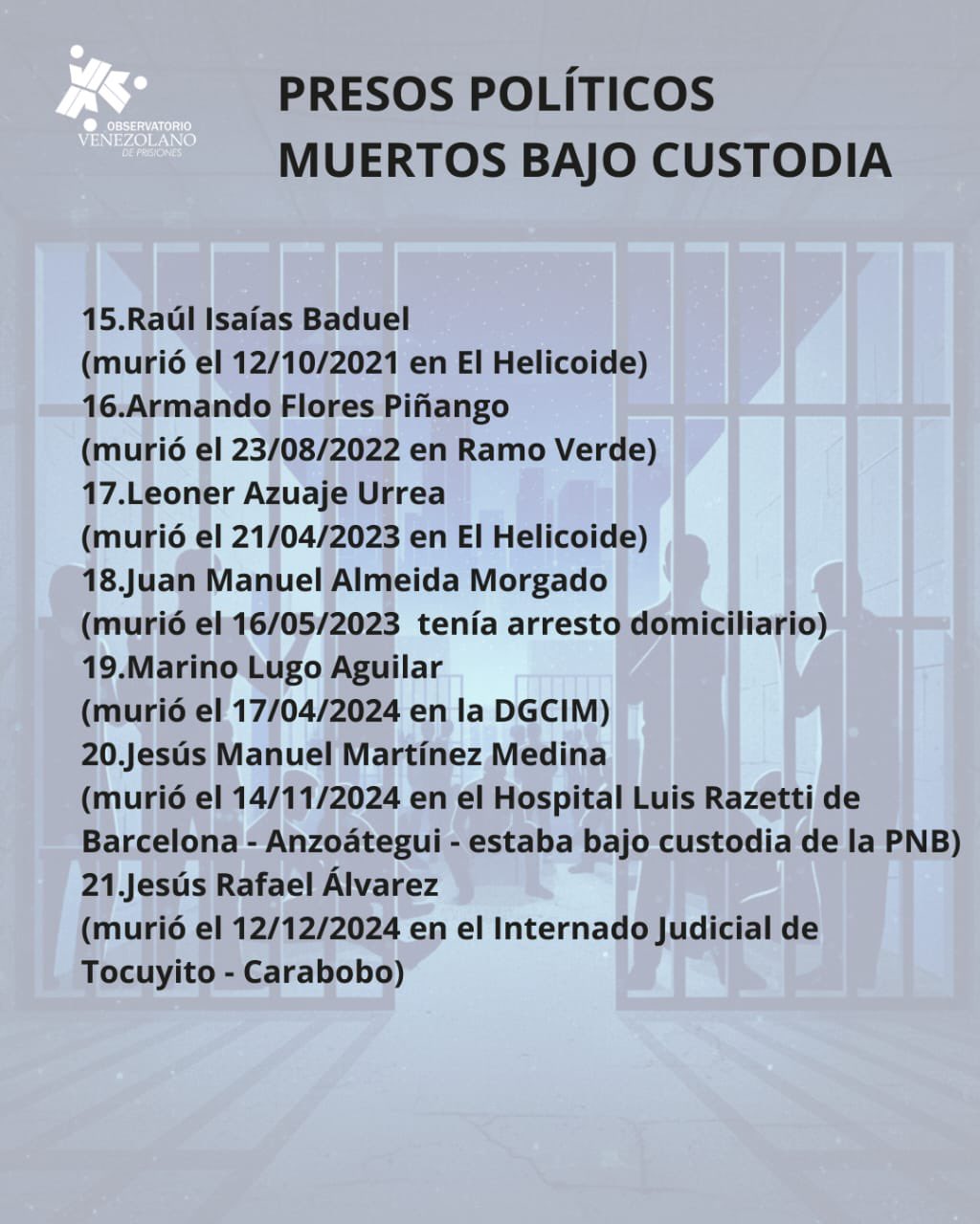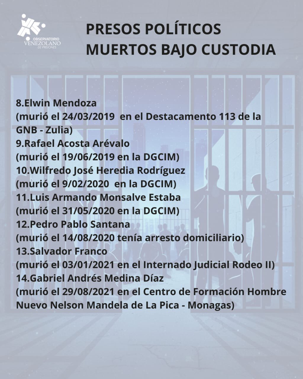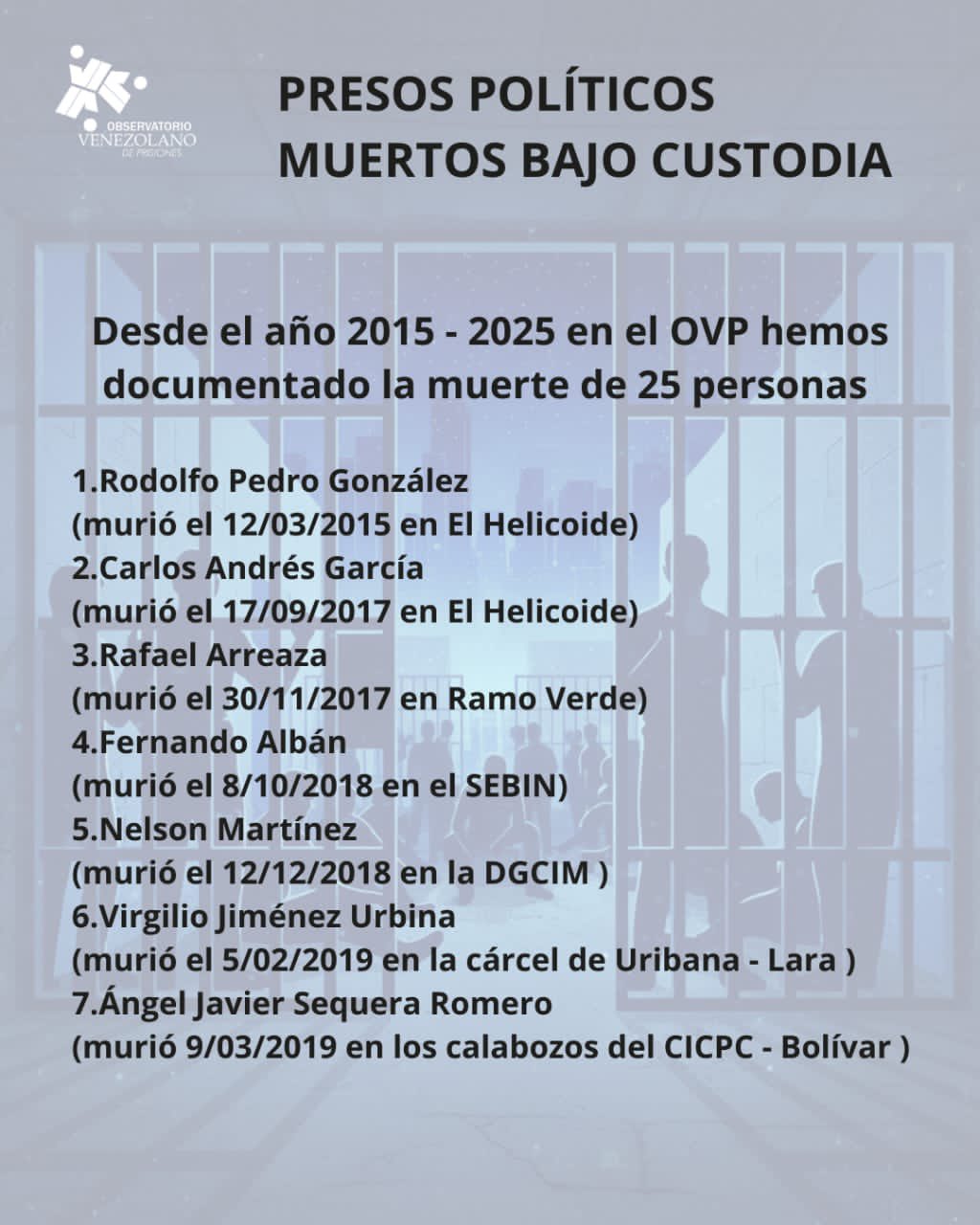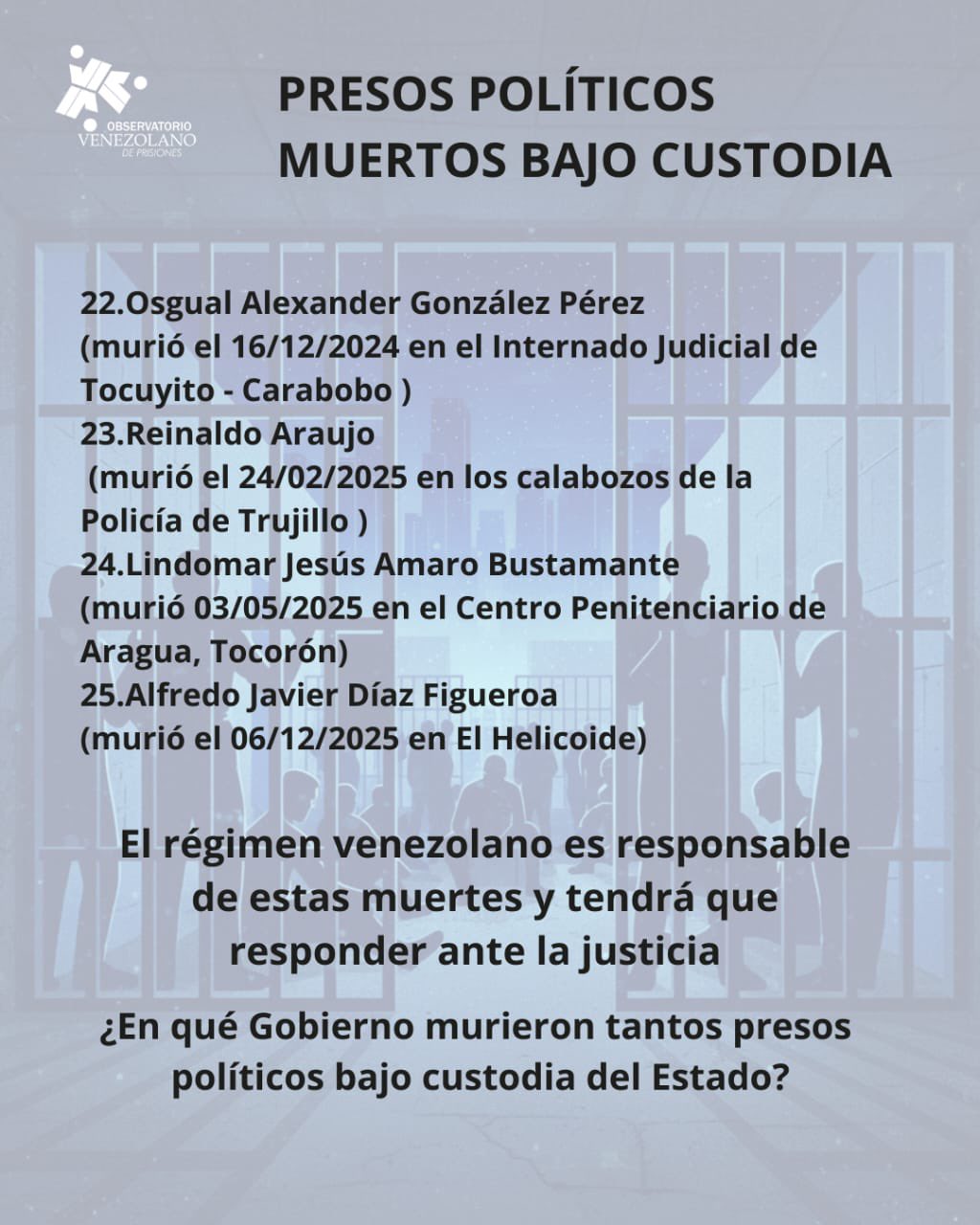 «Desde el OVP nos preguntamos: ¿En qué Gobierno murieron tantos presos políticos bajo custodia del Estado?», sentenció la ONG.