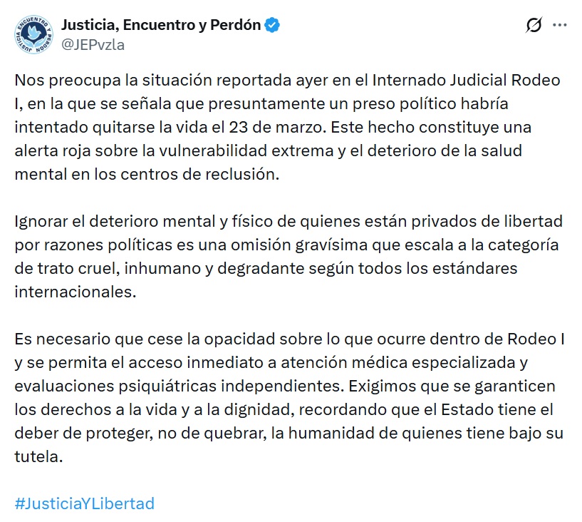 La ONG Justicia, Encuentro y Perdón (JEP) emitió un llamado de alerta ante lo que calificó como una situación de «vulnerabilidad extrema y deterioro de la salud mental» en la cárcel El Rodeo I, luego de que el pasado martes se reportara que un preso político intentó quitarse la vida.