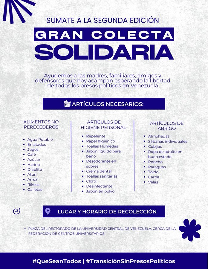 Este sábado se realiza en la Plaza del Rectorado de la Universidad Central de Venezuela (UCV) la segunda colecta solidaria del Comité por la Libertad de los Presos Políticos (clippve) para ayudar a los familiares de los detenidos arbitrariamente por razones políticas que acampan en los alrededores de las cárceles.