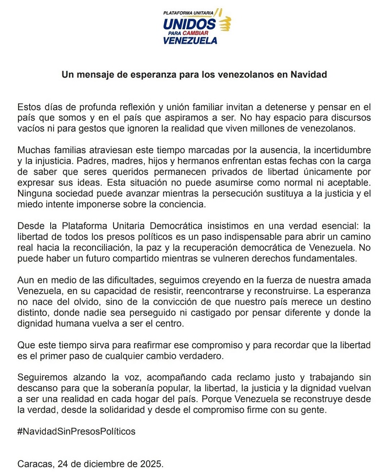La Plataforma Unitaria Democrática (PUD) emitió un comunicado en el que exige al régimen de Nicolás Maduro una Navidad sin presos políticos, quienes se encuentran tras las rejas de los centros de tortura solo por pensar diferente.