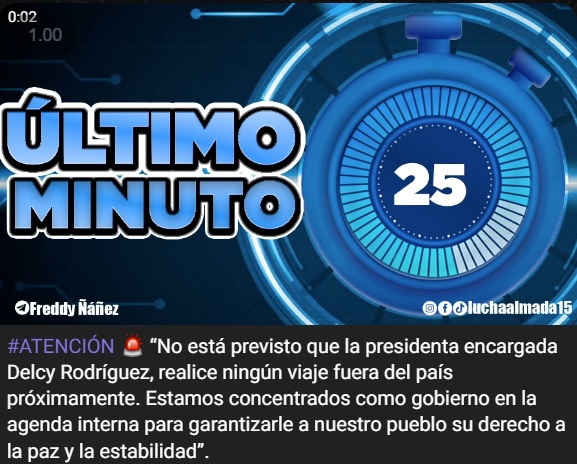 «No está previsto que la presidenta encargada, Delcy Rodríguez, realice ningún viaje fuera del país próximamente», dijo Ñáñez en un mensaje en su canal de Telegram.